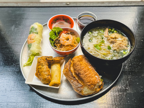 チキンフォーをはじめ、バインミー、ミントの手羽先(ベトナム式手羽揚げ)、バナナの春巻き、生春巻き、ヤムウンセン、ベトナムコーヒーの7種類のメニューが入ったランチセットです。