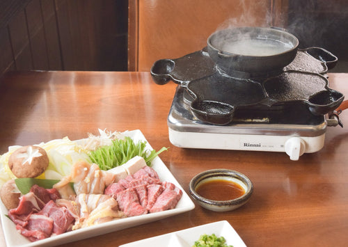 〈ほこるや〉で使用しているのは、南部鉄器製の鍋。“兜の頭”に見立てた部分では水炊きが、“兜のつば”を思わせる鉄板部分では焼きものができます。